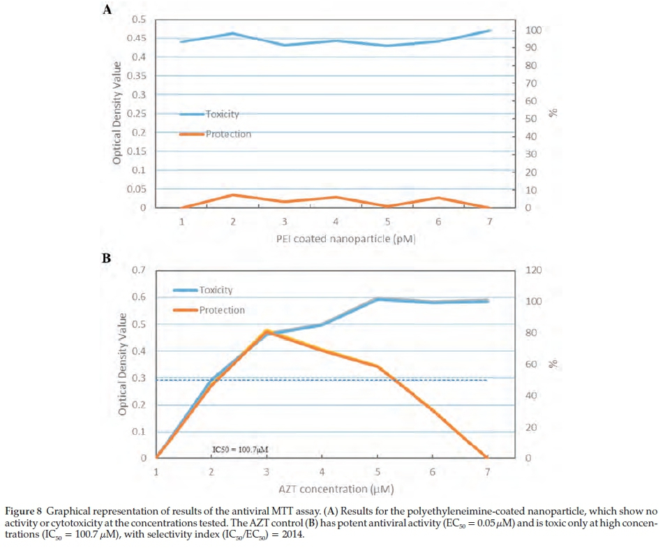 The antiviral assay to assess the cytoprotective (antiviral) effect (50 % effective concentration, EC50) and selectivity index (SI) of the nanoparticle was performed as previously described.90 The final nanoparticle solution (10 μL) was added to 90 μL complete media in 6 wells of a column of a microtitre plate. Serial 10-fold dilutions were made. No treatment was added to the last column, which served as the untreated control. Then 60 μL of MT4 lymphocytes (at6x105 cells mL-1) was added to all wells (except outer wells, to avoid edge effects). To assess cytotoxicity, 50 of RPMI was added to each well in the 'upper' half of the plate (mock infection) while 50 of HIVIIIB at 300 Tissue Culture Infective Dose (TCID)50 was added to the 'lower' half (HIV infection) to assess antiviral effect. The plates were incubated for 5 days at 37 °C in 5 % CO2 in a humidified incubator. At the end of the incubation period, the MTT assay, as described above, was performed to assess toxicity in mock (uninfected) cells and cytoprotective effect in HIV-infected cells. The absorbance readings were plotted on a graph and the IC50 and EC50 were determined by linear extrapolation.