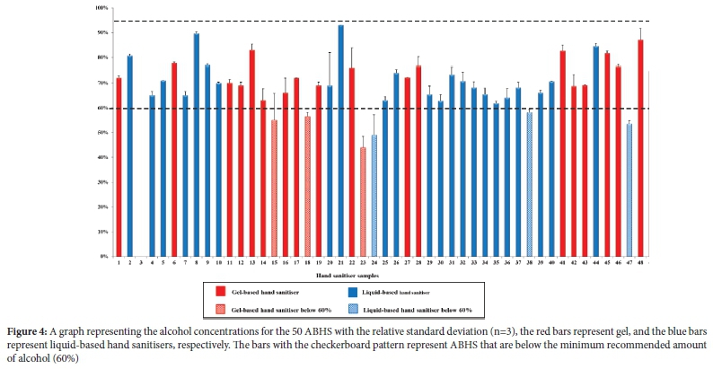 Herein this study, the data revealed that 12% (3 gels and 3 liquid ABHS) contained <60%. This is of great concern since a minimum of 60% alcohol is needed to act as a microbicide, virucide, or bactericide.4,10,11 The CDC also recommends a minimum concentration of 60% alcohol in ABHS. In our results (Figure 4), the general trend is that the samples contained around 60% alcohol. If the alcohol content in hand sanitisers is below the aforementioned requirement, this will limit the growth of pathogens instead of killing them.10 As such, these conditions allow for the creation of highly virulent 'superbugs.17,20