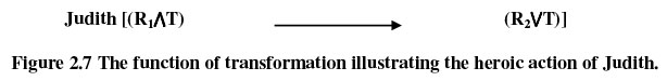 Fig. 2.6 illustrates the transformation of the Jewish religion (designated as R) from a religion under threat of extinction (designated as R1) on account of the Assyrians and the presence of Holofernes, to a religion that survives extinction (designated as R2)under Judith. In a Greimassian semiotic approach/terms, the unfolding of the story is a transformation from a state of disjunction (designated as ˄) (mission to be accomplished by Judith) to a state of conjunction (designated as ˅) (mission accomplished). In this representation, the subject of transformation is the Jewish religion.