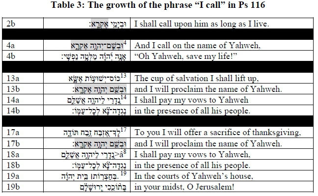 In Ps 116, at first only the verb אֶקְׁ רא appears in v. 2 as a Leitmotiv. It is subsequently repeated three times as part of the expression "I shall call on/proclaim the name of Yahweh." This expression is part of the refrain which unites the different parts of the psalm. While it is repeated, it is also expanded continually into a form we might call the growing phrase.25Not only is the phrase expanded in such a way that the cola is growing numerically, but it is also growing in importance to reach a climax in vv. 17-19.