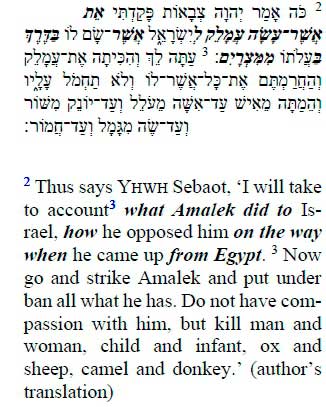 Add to this the use of the Deuteronomic locution נכה וחרם ("strike and put to ban"; Deut 7:2) in 15:3. 1 Sam 15:2-3 combines the quotation from Deut 25:17 with another Deuteronomic locution. When the reader recognises the verbal link to Moses' call to remember, the harsh approach against Amalek becomes understandable. The call on Saul for herem is not due to some recent assaults on Israel (1 Sam 14:48), but to a profound conflict between God and Amalek. The quotation reinforces the command from Deut 25:19 to blot out any remembrance of Amalek. Israel shall not only remember the misdeeds of the Amalekites and act accordingly, but God himself has noticed and will take the desert tribe to account. 1 Sam 15:2-3 reinterprets the demand in Deut 25:17-19 on Israel to remember persistently what Amalek did into a statement of God's active resentment against this Bedouin tribe.