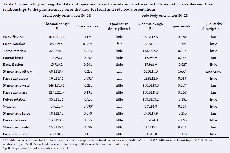 RESULTS: Side-on body orientation passes were more accurate than front-on body orientation passes (p<0.0001). Fair relationships were present between the pass accuracy and upper body and hip kinematics for the two distinct body orientations individually. However, no common relationships were observed between the different orientations.