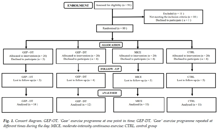 Staff from the university were invited to participate in the study voluntarily. Participants were screened using a questionnaire to ensure that they met the inclusion criteria of the study. Participants were included in the study if they were between 30 and 49 years old and had two or more risk factors for CVD, such as physical inactivity, were overweight or obese, elevated blood pressure and elevated lipid profile. The participants should not have had any signs and symptoms of CVD, such as chest pain, dyspnoea, syncope, orthopnoea, tachycardia, known heart murmurs and unusual fatigue with activities of daily living. A physician medically cleared the participants for participation in the study. Using simple random sampling, participants were assigned to the following groups: 'Gear' exercise programme repeated at different times during the day (GEP-DT): cycled for 90 seconds, repeated three times/day, for three days/week (n = 12); 'Gear' exercise programme at one point in time (GEP-OT): cycled for 90 seconds followed by 4 minutes and 30 seconds rest, repeated three times at one point in time, for three days/week (n = 14); 30 minutes of moderate-intensity continuous cycling repeated three days/week at 55-69% HRmax (n = 11); and the controls, who were encouraged not to exercise (n = 11). Few participants were unable to participate in the follow-up assessments due to work commitments, family responsibilities and orthopaedic injuries not related to the exercise interventions (Fig.1). Forty-eight participants completed the study (GEP-DT = 14; GEP-OT = 12; MICE = 11; CTRL = 11). The exercise programmes did not result in adverse events (Fig. 1).