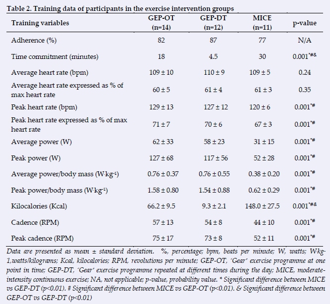 The mean age of participants in the training groups was GEPOT = 37 years, GEP-DT = 39 years, MICE = 40 years and CTRL = 38 years. More women than men participated in the study. There was no significant difference of age, fitness level and body mass between the subject groups at baseline (Table 1). The GEP-DT group had the highest adherence rate (87%) and the shortest significant exercise time commitment of 4 minutes and 30 seconds compared with the GEP-OT (18 minutes) and the MICE group (30 minutes). There was a significant difference in kilocalories in all the exercise groups. The average kilocalorie expenditure in the MICE group was 16 times that of the GEP-DT. There was a significant difference in peak heart rate, average power, peak power, average power/body mass, peak power/body mass and cadence between the GEP-DT vs MICE and the GEP-OT vs MICE. The GEP-OT (129±13 bpm) had the highest peak exercise heart rate compared to MICE and GEP-DT groups.