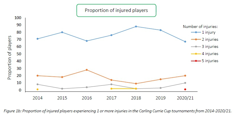The data in this report is aligned with the most recent IOC consensus statement [4] and is further presented such that it facilitates comparison with previous season reports and the meta-analysis [1]. Table 2 presents the Carling Currie Cup 2020/21 injury data in the format recommended by the most recent IOC consensus statement. This provides an overview of the 2020/21 season's data in this format, with the data explored in more detail throughout the report.
