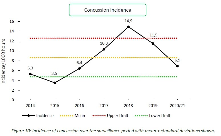 Concussions contributed to 8% (n = 11) of all Time-Loss injuries for the Carling Currie Cup 2020/21, which equates to an incidence of 6.9 (2.8 - 10.9) concussions per 1000 hours. Concussion incidence has trended downwards since 2018, and an incidence of 6.9 is slightly lower than the mean for the surveillance period but falls within the expected limits of season-to-season variation, for the Carling Currie Cup (Figure 10). The average severity of concussions reported in the 2020/21 tournament was 10 days (IQR 5 - 18 days). The current South African Rugby concussion regulations do not normally allow for adult players to return within less than 12 days of the concussive event. As this competition takes place at the professional level and is a World Rugby approved tournament, Advanced Care protocols are implemented and carried out by the medical practitioner that could potentially allow a player to return-to-play in less than 12 days.