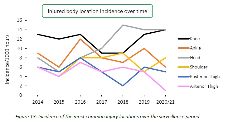 When looking at the injury incidence of the most common injury locations over the surveillance period, the most noticeable trend is the initial increase in incidence of injuries to the head from 2014-2018, followed by a stabilization or levelling off thereafter. With the majority of injuries to the head comprising of concussions, this trend reflects a similar pattern to that seen in the concussion section above, albeit that the concussion rates decreased over the last two years. A variable trend in injury incidence is depicted in the other injury locations (Figure 13).