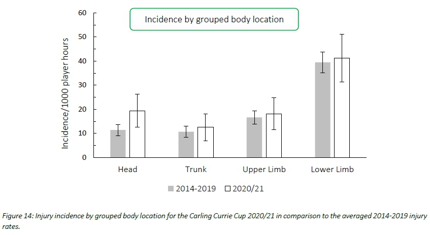 The injury rate of Time-Loss injuries for the Carling Currie Cup 2020/21 was 91 (76 to 106) injuries per 1000 player hours (mean and 95% confidence intervals), which is higher than the international rate of 81 (63 to 105) injuries per 1000 player hours [1], but within the expected limits of season-to-season variation for the Carling Currie Cup. This equates to 1.8 injuries per team per match.
