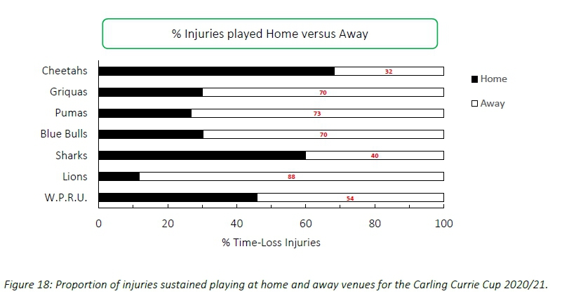Across all teams, and although not significant, playing at home [38 (28 to 47) injuries per 1000 player hours) had a lower injury rate than playing away [54 (42 to 59)] injuries per 1000 player hours) in the Carling Currie Cup 2020/21 tournament. The Cell C Sharks and Toyota Free State Cheetahs sustained more injuries playing at home than away, while all other teams sustained more injuries when playing away (Figure 18).
