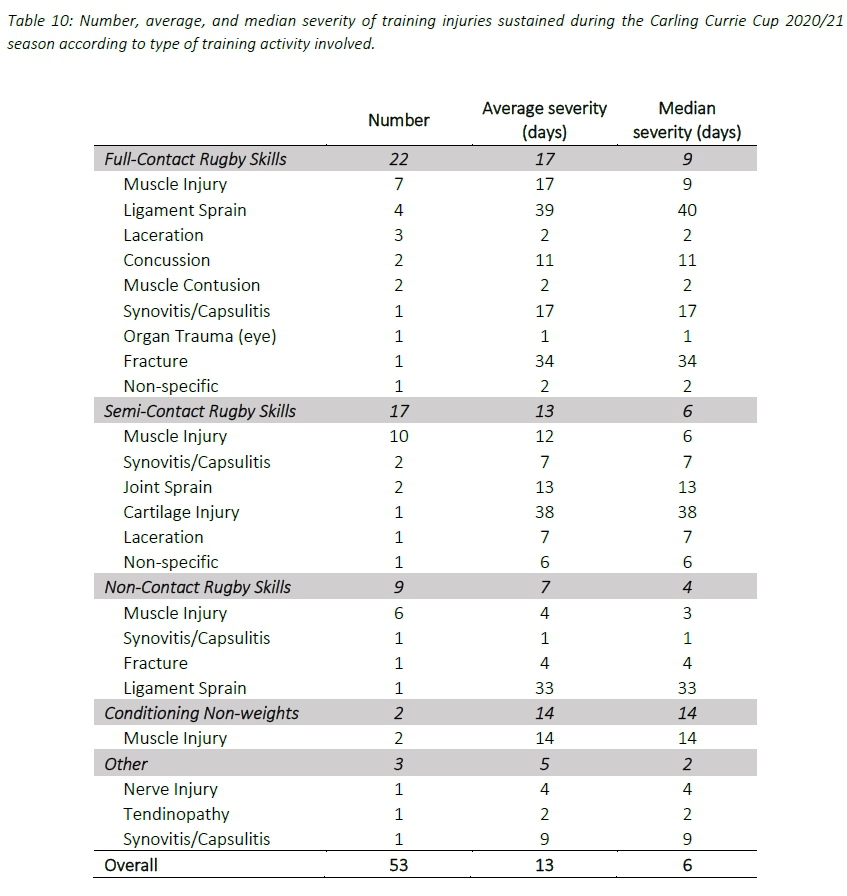 The most common injury type sustained in all training activities was Muscle Injuries, with Ligament Sprain Injuries sustained in Full-Contact Rugby Skills training carrying the highest average severity at 39 days (Table 10).