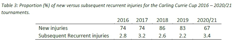 A subsequent recurrent injury was any subsequent injury classified as 'same site - same type', which refers to the same location and same tissue type involved as the original index injury. There were five subsequent recurrent injuries in the Carling Currie Cup 2020/21. The overall injury rate for subsequent recurrent injuries was 3 (0.4 to 5.9) injuries per 1000 player hours, which is significantly lower than the meta-analysis rate of 11 (10 to 12) injuries per 1000 player hours [1]. When comparing the new and subsequent recurrent injuries across the Carling Currie Cup 2016 - 2020/21 tournaments, there was a decrease in the proportion of new injuries and increase in the proportion of subsequent recurrent injuries in 2020/21 in comparison to previous seasons (Table 3).