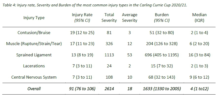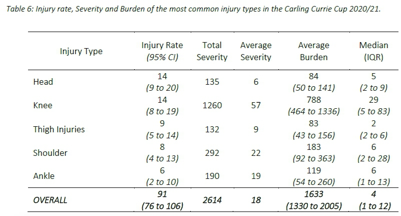 Overall, the injury rate for New injuries for the Carling Currie Cup 2020/21 was 62 (50 to 74) injuries per 1000 player hours, which is lower than the meta-analysis [1] rate of 78 (74 to 83) injuries per 1000 player hours. The average severity for New injuries in the Carling Currie Cup 2020/21 was 8 (5 to 11) days, which is lower than the average severity reported in the meta-analysis [1] of 20 (15 to 24) days.