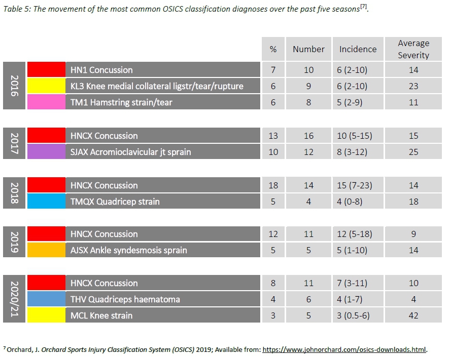 The most frequent OSICS classification diagnosis7 in the Carling Currie Cup 2020/21 was HNCX Concussion. Concussions have remained the most frequently diagnosed injury for the past 5 seasons (Table 5).