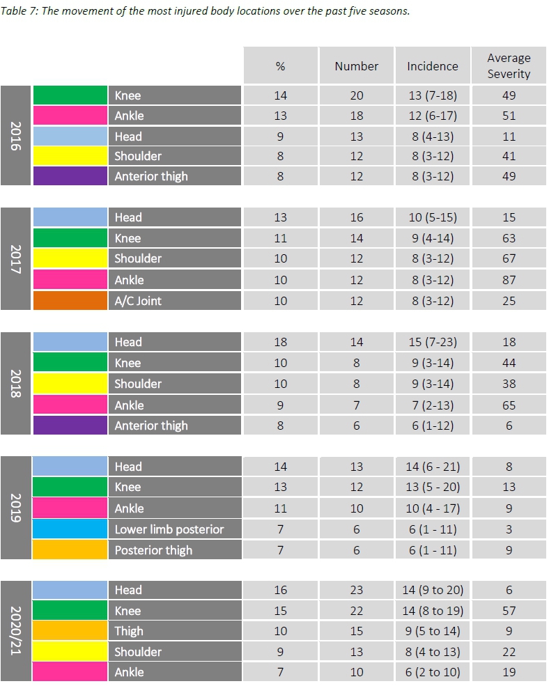 When looking at the movement of the most common body locations for the Carling Currie Cup over the past five seasons, the head and knee have remained the first and second most injured body locations respectively from 2017-2020/21. While the incidence of injuries to the head and knee in the 2020/21 season are similar to that in 2019, the average severity of injuries to the knee has increased (Table 7).
