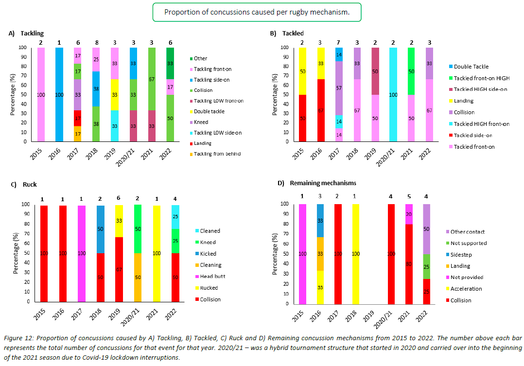Figure 12 presents the mechanisms contributing to concussions in Tackling, Tackled, Ruck and the remaining concussion causing injury events from 2015 - 2022. Data have only been presented from 2015 onwards as Tackle related data were not captured separately for the Tackler and Ball Carrier in 2014.