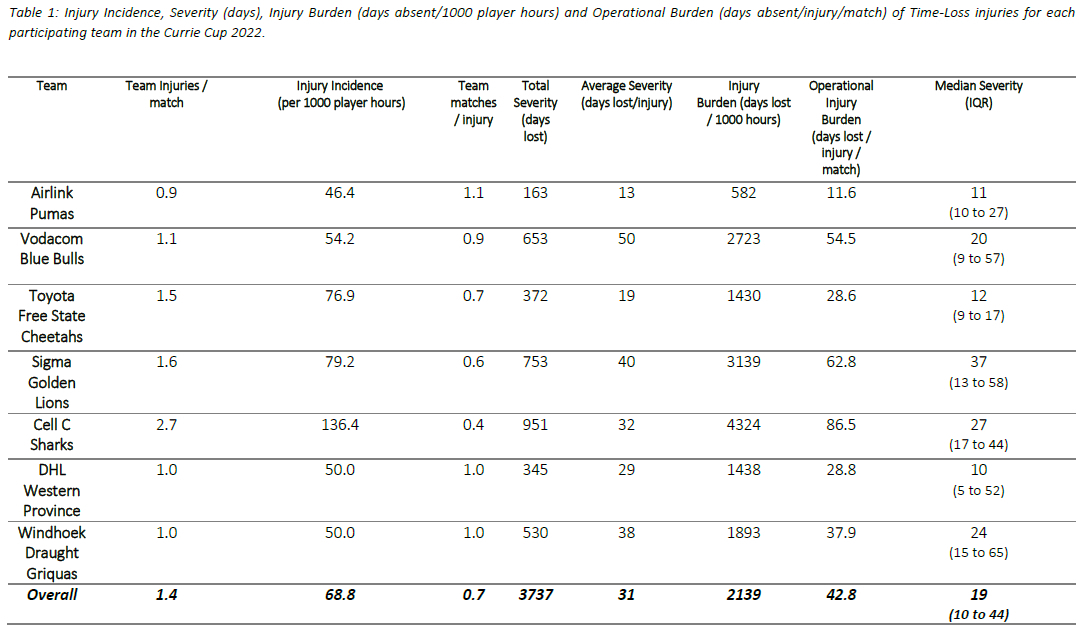Table 1 describes the actual severity of each teams' Time-Loss injuries for the Currie Cup 2022. The Airlink Pumas have been used as a worked example to explain Table 1. The Airlink Pumas sustained 0.9 injuries per match, meaning that for every 1.1 matches played, they sustained one injury. The Airlink Pumas lost 163 training and match days due to injury. This equates to an average of 13 training and match days lost for every injury sustained. The burden of the team's injuries equates to 582 days lost per 1000 player hours. Translating this to an operational burden per match shows that the Airlink Pumas lost 11.6 days per injury per match over the season. The median injury severity for the Airlink Pumas was 11 days (IQR 10 to 27). This means that when severities of the Airlink Pumas Time-Loss injuries were rank ordered, the midpoint of the severities was 11 days off from rugby, with 25% of their injuries lasting equal to or less than 10 days off and 25% of their injuries lasting equal to or longer than 27 days off.