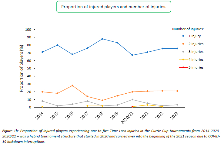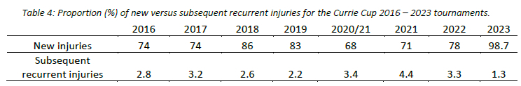 The proportion of new injuries increased, and subsequent recurrent injuries decreased compared to the Currie Cup 2022 tournament (Table 4).