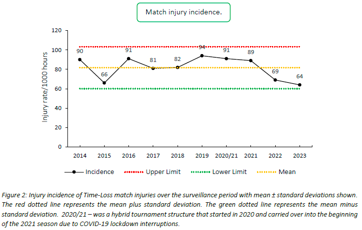 Overall, the combined average injury incidence of 75 (61 to 89) injuries per 1000 player hours for all the teams over the last 10 years is similar to the international meta-analysis summary of 91 (77 to 106) injuries per 1000 player hours [1].