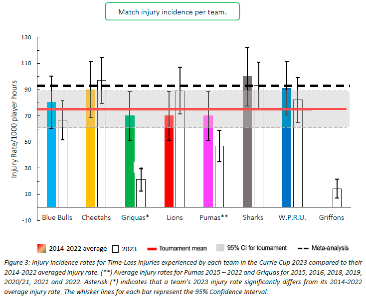 The Toyota Free State Cheetahs, who subsequently won the tournament, had the highest injury rate for Time-Loss injuries throughout the Currie Cup 2023 tournament. Windhoek Draught Griquas had a significantly lower injury rate in 2023 than their 2014-2022 tournament average. The Fidelity ADT Lions had the highest average severity of 32 days absent per injury, whereas the HOLLYWOODbets Sharks had the lowest average severity of 12 days absent per injury. The average severity of Time-Loss injuries in the 2023 tournament was 19 days, lower than the 27 days reported in the international meta-analysis [1]. The median injury severity of all Time-Loss injuries was 12 days, with 25% of injuries lasting 9 days or less and 25% lasting 24 days or more due to injury.