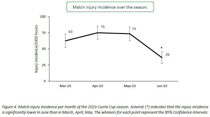 The overall match injury incidence for the Currie Cup 2023 was 64 (54 to 75) injuries per 1000 player exposure hours, the lowest injury rate in the last 10 years. The 2023 Currie Cup tournament's injury rate is significantly different to the international meta-analysis injury rate of 91 (77 to 106) injuries per 1000 player hours [1] but falls within the season-to-season variation for the Currie Cup, based on the last 9 years' collective data (Figure 2). An injury incidence of 64 injuries per 1000 player hours equates to 1.3 injuries per team per match or roughly 4 injuries for every 3 matches played.