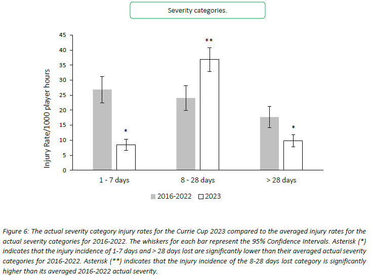 Figure 6 compares the injury severity rates for the Currie Cup 2023 tournament with the averaged injury severity rates from the 2016-2022 tournaments. Injury rates in the severity category of '1-7 days' and > 28 days' were significantly lower in 2023 compared to their 2016-2022 average (Figure 6). Additionally, injury rates in the severity category of '8-28 days' were significantly higher in 2023 compared to their 2016-2022 average.
