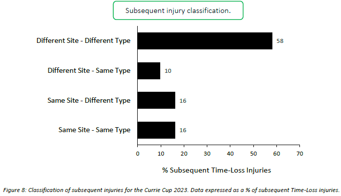 A subsequent recurrent injury was any subsequent injury classified as 'same site - same type', which refers to the same location and same tissue type involved as the original index injury. Only two subsequent recurrent injuries occurred in the Currie Cup 2023.