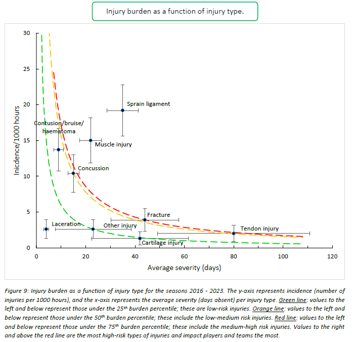 Figure 9 shows the injury burden for the period 2016-2023. Ligament sprain followed by muscle injury were the two injury types with the highest burden when data were combined for the 2016-2023 Currie Cup tournaments. These injury types have the highest combination of injury incidence and average injury severity. Consistent with previous reports, these two injury types continue to dominate across the different teams.