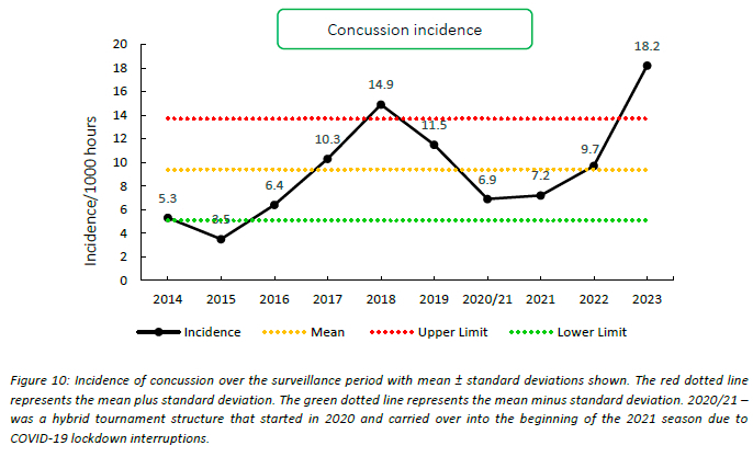 Concussions contributed to 43 injuries in the Currie Cup 2023 (28%). Concussion incidence increased from 9.7 injuries per 1000 player exposure hours in 2022 to 18.2 injuries per 1000 player hours in the Currie Cup 2023 tournament. In practical terms, this equates to 0.7 concussions per match, one concussion every 1.4 matches, or one can expect 7 concussions for every 10 matches played. This increase falls outside the expected season-to-season variation for the Currie Cup (Figure 10), with an overall grouped tournament average of 9.4 concussions per 1000 player hours over the entire data collection period. The average severity of concussions reported in the 2023 tournament was 16 days, with a median severity of 12 days (IQR 12 - 16 days). World Rugby approved the use of the Head Injury Assessment (HIA) protocol for the Currie Cup Tournament. Players' concussion management and Return to Play is per the HIA protocol.