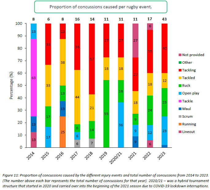 Figure 11 shows the total number of concussions per year and the proportion of concussions caused by different injury events. The total number of concussions increased dramatically in 2023. The main causes of concussion during the Currie Cup 2023 were Tackling (40%), followed by the Ruck and Open Play (both 23%).