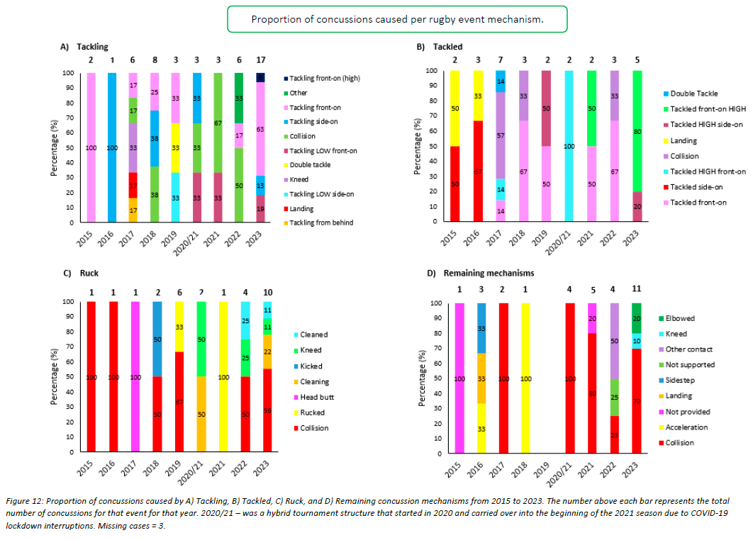 Figure 12 presents the mechanisms contributing to concussions in Tackling, Tackled, Ruck and the remaining concussion causing injury events from 2015 - 2023. Data were only presented from 2015 onwards as Tackle related data were not captured separately for the Tackler and Ball Carrier in 2014. Tackling front on (regulation) dominated Tackler concussions in 2023 (63%), being Tackled front-on high (80%) in ball carriers, Collisions in the Ruck (56%), and Collisions in Open Play (70%). It was also worth noting that all Tackling-, Ruck-, and the Remaining mechanism-related concussion numbers increased quite noticeably in 2023.