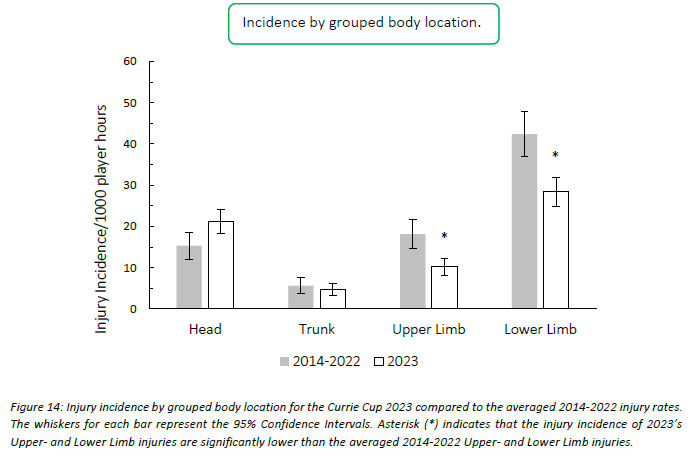 During the Currie Cup 2023, lower and upper limb injury rates were significantly lower than their 2014-2022 average injury rates (Figure 14). During the Currie Cup 2023, the head and knee areas had the highest injury rates, with 20 (14 to 25) and 13 (8 to 17) injuries per 1000 player hours, respectively. The head injury rate was higher than that of the international meta-analysis [1] of 17 (14 to 20) injuries per 1000 player hours but not significantly. The knee injury rate is similar to the meta-analysis [1] injury rate of 13 (12 to 14) injuries per 1000 player hours.