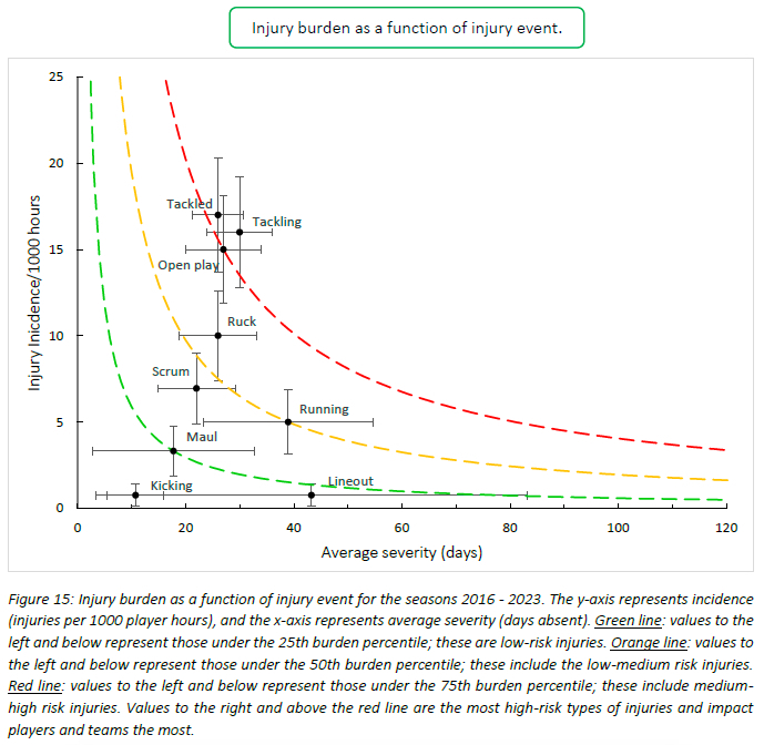Figure 15 combines all the injury events from 2016 - 2023 and presents the injury burden picture over the past eight years. Injuries caused by Tackling have the highest injury burden for all teams, followed closely by injuries from being tackled. Both these injury events have a high combined injury incidence and average severity. Open play followed closely behind these two leading injury-causing events.