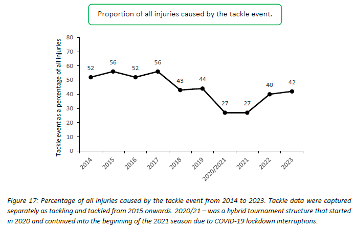 Figure 16 illustrates the proportion of injuries caused by different events from 2014 to 2023. After a drop in 2018, the rate of injuries caused by tackles has varied over the past six seasons, although it has consistently remained lower than the levels from 2014 to 2017. After a period of decline between 2018 and 2021, the Tackler role has started to rise again, and one needs to monitor this going forward (Figure 17). The tackle event in the last 10 years has contributed on average to 44% of all injury events in the Currie Cup, and since the roles were split into Tacklers and Ball Carriers in 2015, 51% of these have been to Tacklers, and 49% to Ball Carriers.