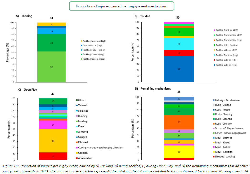 Figure 18 presents the mechanisms contributing to injuries in Tackling, Being Tackled, Open Play and the Remaining mechanisms for all other injury-causing events in 2023. Tackling front-on (regulation) dominated Tackler injuries in 2023 (52%), being Tackled side on (regulation) in ball carriers (43%), Collisions in Open Play (38%), and Collisions in the Ruck (23%).