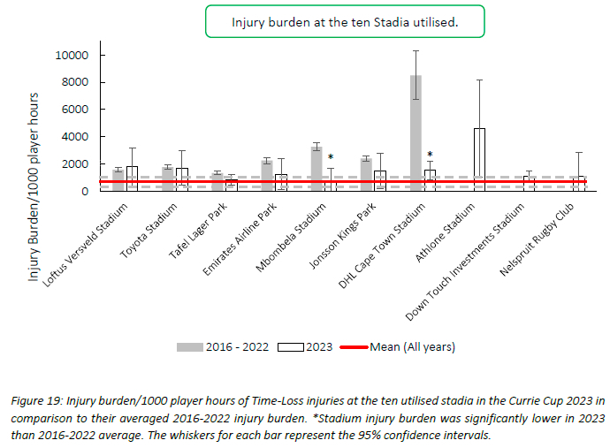 Matches were played at ten different stadia during the tournament. This is the first year that the Athlone Stadium, Down Touch Investments Stadium and Nelspruit Rugby Club were used during the Currie Cup tournament. Athlone Stadium's injury burden is above the average injury burden (Figure 19), but given the wide confidence intervals, little can be inferred from this at present. In 2023, Mbombela Stadium and DHL Cape Town Stadium's injury burden was significantly lower than their 2016-2022 average.