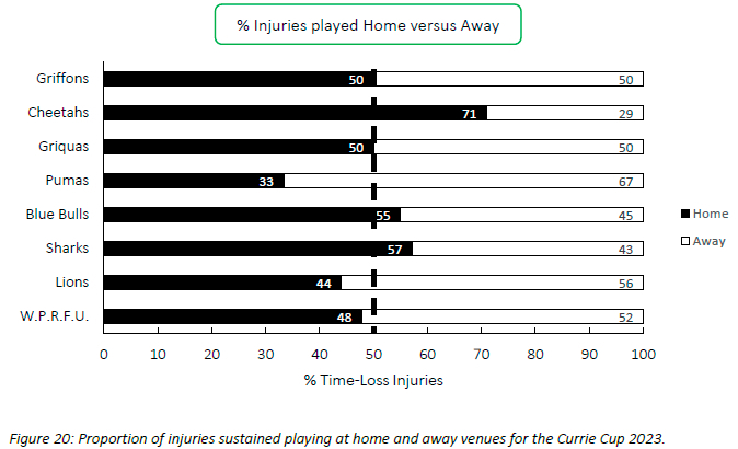 Figure 20 presents the proportion of injuries sustained playing at home and away venues in the Currie Cup 2023. When comparing injuries while playing away and at home in the Currie Cup 2023 tournament, playing at home at 31 (23 to 37) injuries per 1000 player hours recorded a similar injury rate to playing away with 34 (27 to 42) injuries per 1000 player hours. The Toyota Free State Cheetahs, Vodacom Blue Bulls and HOLLYWOODbets Sharks, all experienced more injuries when playing at home compared to playing away. In contrast, Airlink Pumas, Fidelity ADT Lions and DHL Western Province Rugby Football Union (W.P.R.F.U) experienced more injuries while playing away compared to at home. Novavit Griffons and Windhoek Draught Griquas had an equal distribution of injuries at home and away matches.