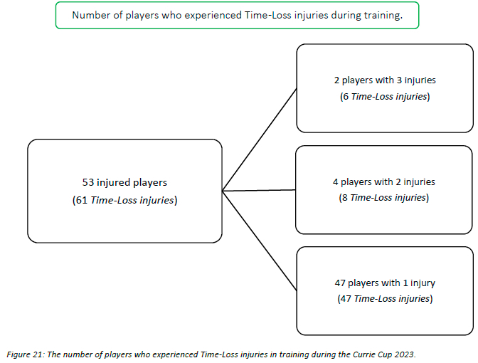In the Currie Cup 2020/21 seasonal report, the South African Rugby Injury and Illness Surveillance and Prevention Project (SARIISPP) began capturing Time-Loss training injuries and training exposure data. This addition enables SARIISPP to gain a more comprehensive understanding of injury data by combining match and training exposure and injury data.