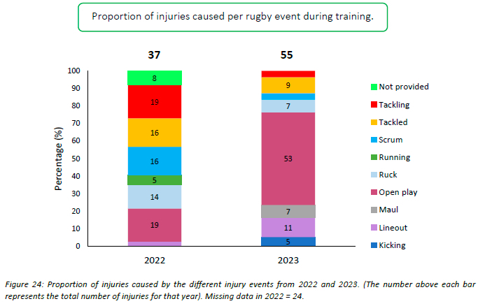 Figure 24 displays the proportion of injuries caused by the different injury events from 2022 and 2023. Strength and conditioning-related injury events were removed due to them not being a rugby-specific event. Open Play had the highest proportion of training injuries and increased substantially in 2023 (Figure 24). Injuries in the tackle event (both Tackling and Tackled player) decreased in 2023.