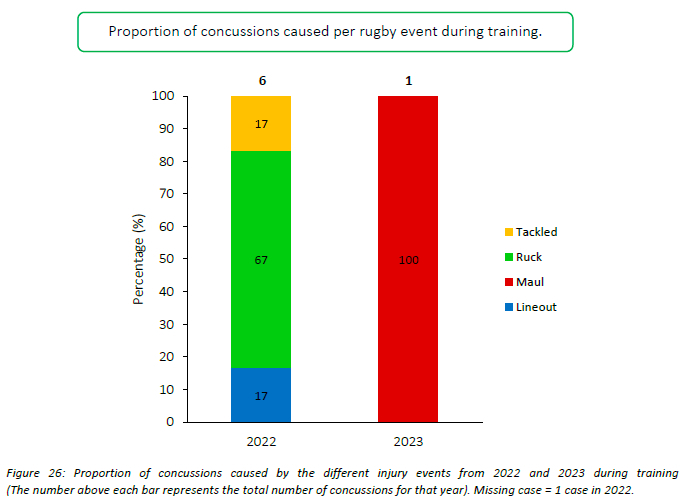 In 2023, the concussion occurred during a collision in the maul, whereas in 2022, most concussions occurred in the ruck (Figure 26).