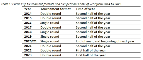 As part of the South African Rugby Injury and Illness Surveillance and Prevention Project (SARIISPP), the medical doctors and medical support staff of the respective teams recorded the injury data for the annual Currie Cup 2023 Premiership Division Competition ('Currie Cup'). SARIISPP has been collecting and analysing these data annually since 2014 for the Currie Cup tournament. Historically, there have only been seven teams participating in this tournament. However, 2023 was the first year the Griffons joined the Currie Cup competition, bringing the total to eight teams. All eight teams must record the injuries that occur in each match and training session in their team throughout the season. The strength and conditioning coaches also recorded their training session data to calculate training exposure data throughout the season. By combining match exposure data, training exposure data, and injury data, SARIISPP aims to obtain a complete understanding of the factors contributing to player injury risk.