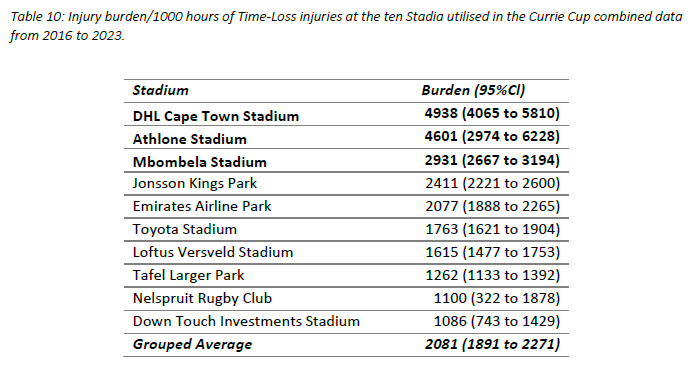 Table 10 shows the ranking of the injury burden of the Stadia from the highest to lowest between 2016 and 2023. When combining the last eight season's data, it highlights that the DHL Cape Town Stadium, followed by Athlone Stadium, recorded the highest injury burdens overall, with DHL Cape Town Stadium, Athlone Stadium, and Mbombela Stadium averaged injury burden being significantly higher than the grouped average injury burden from 2016-2023 (Table 10).