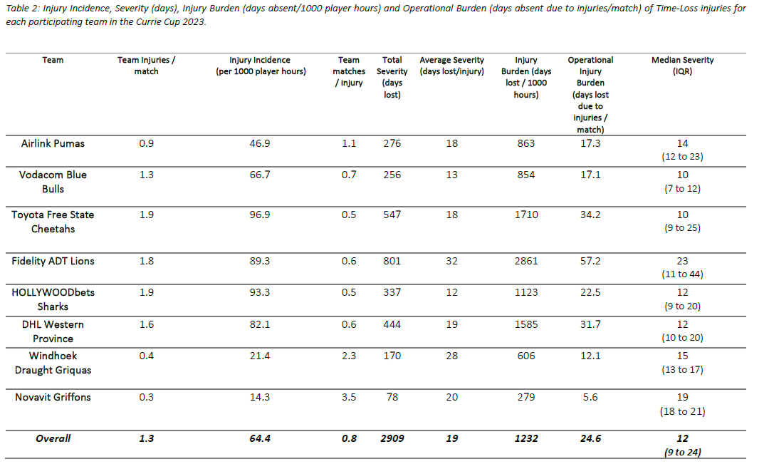 Table 2 describes the relationships between incidence, actual severity, and injury burden of each teams' Time-Loss injuries for the Currie Cup 2023. The Toyota Free State Cheetahs have been used as a worked example to explain Table 2. The Toyota Free State Cheetahs sustained 1.9 injuries per match, meaning that for every 0.5 matches played, they sustained one injury. The Toyota Free State Cheetahs lost 547 training and match days due to injury. This equates to an average of 18 training and match days lost for every injury sustained. The burden of the team's injuries equates to 1710 days lost per 1000 player hours. Translating this to an operational burden per match shows that the Toyota Free State Cheetahs, within their player group, effectively lost 34.2 days due to injury per match played over the season. The median injury severity for the Toyota Free State Cheetahs was 10 days (IQR 9 to 25). This means that when severities of the Toyota Free State Cheetahs Time-Loss injuries were rank ordered, the midpoint of the severities was 10 days off from rugby, with 25% of their injuries lasting equal to or less than 9 days off, and 25% of their injuries lasting equal to or longer than 25 days off.