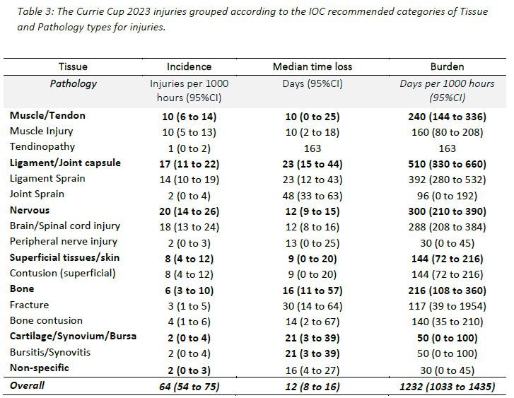 All the data in this report are aligned with the 2019 IOC consensus statement [2] and are further presented as such to compare against previous season reports and the international meta-analysis [1]. Table 3 presents the Currie Cup 2023 injury data in the format recommended by the 2019 IOC consensus statement. This table provides an overview of the Tissue and Pathology types of injuries sustained during the 2023 season. This format is used throughout this report.
