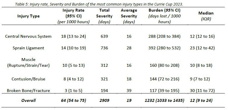 The most common Time-Loss injuries during the Currie Cup 2023 tournament were central nervous system injuries, recorded at 18 (13 to 24) injuries per 1000 player hours. The average severity for central nervous system injuries was 16 (12 to 19) days.