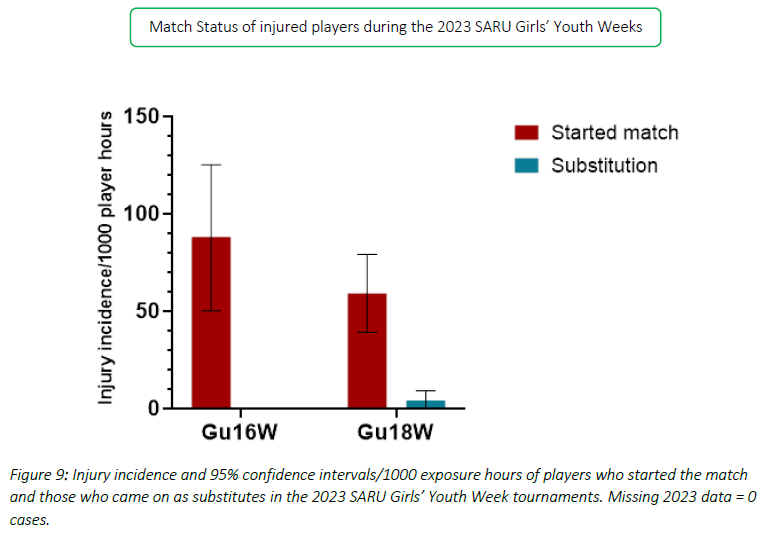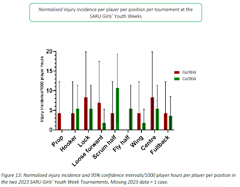 Centres and locks had an absolute injury incidence of 12.5 (4.8 - 20.2) injuries/1000 player hours (Figure 12). Absolute incidence refers to the incidence or rate of injury in a player's positional grouping, e.g., wings, without normalising for the number of players on the field playing in that positional grouping per team, e.g., there are two wings per team on the field. In 2023, the centre and lock positions had the highest absolute injury incidence rates across the SARU Girls' Youth Week tournaments.