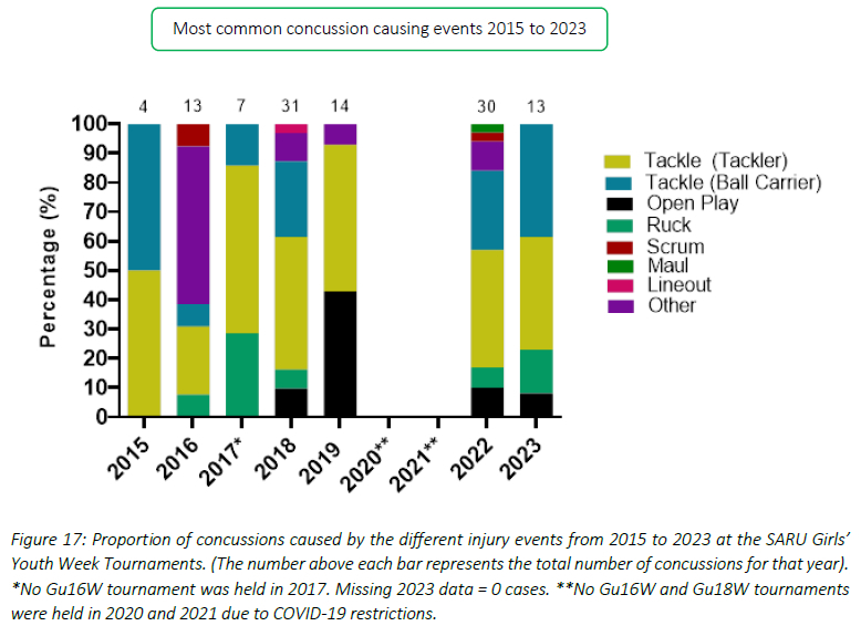 Figure 17 displays the proportion of concussions caused by the different event mechanisms from 2015 to 2023. The Tackle event was the most prominent cause of concussions between 2015 and 2023, contributing to 65% of all concussions: 39% to the Tackler, 26% to the Ball Carrier. This could be due to poor tackle and ball carrying techniques. However, further video-analysis investigations are needed to verify and confirm this. Regardless, due to the high proportion of contributions towards all injuries and concussions, it is apparent that tackles and ball carries remain the primary injury-causing events and need to be given more attention in the training and preparation of junior South African female rugby players.