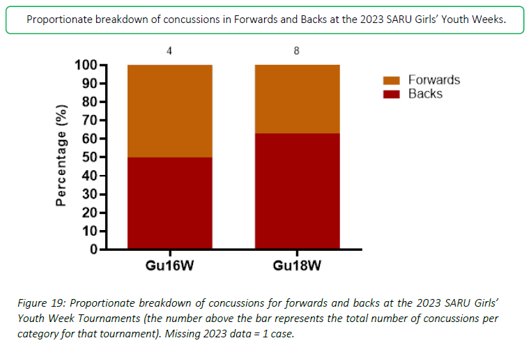 Concussions in 2023 were slightly higher in backs than in forwards. In Gu16W, the concussions were evenly distributed. At the Gu18W, 63% of concussions were sustained by backs. (Figure 19).
