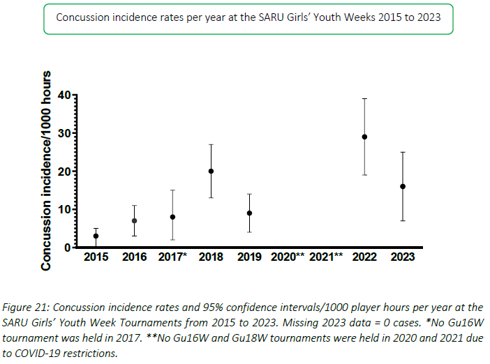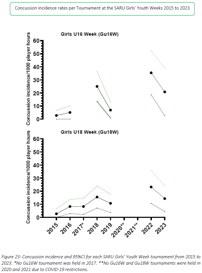 Figure 20 illustrates the total number of concussions from 2015 to 2023 for the SARU Girls' Youth Week Tournaments. The corresponding concussion rate over the same period is shown in Figure 21. The total number of concussions increased sharply from 2019 to 2022, but then decreased in 2023 to a concussion number similar to that of 2019. Keeping in mind that Day 1 of the Gu16W was cancelled due to snow, a similar pattern remained apparent in the incidence of concussion, which normalises the data for player exposure. The spike in 2022 could be attributed to the COVID-19 restrictions in 2020 and 2021; in 2023, these might have decreased back to the original 2018 rates. Players were unable to train, be coached, or compete during COVID-19, which may be a contributing cause to the increased concussion numbers and rates seen in 2022. Alternatively, the interventions provided to the Provincial Unions because of the previous 2022 report, i.e., requesting the provincial Unions to introduce the 'Preparation for Contact' and 'Contact Confident' Modules to their players at least 8 weeks prior, might have assisted in improving the concussion profile of these tournaments. It will be interesting to see if this is maintained in the next year. When combining all concussions over time per tournament (2015 to 2023), concussions and concussion rates tend to be lower at the Gu18W when compared to the Gu16W (Figure 22). However, these differences are not significant.