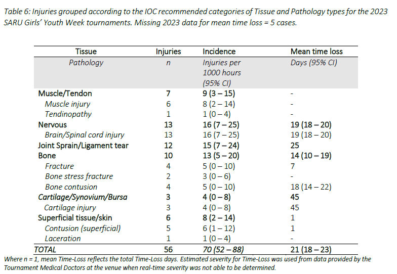 The IOC Consensus statement's recommended categories of Tissue and Pathology injury data are presented in Table 6 for the 2023 SARU Girls' Youth Week tournaments (2).