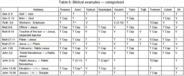 As far as Russian, Azeri, Tatar, Turkmen and Uzbek are concerned, it seems that the Christian sentiments of the translators and believers who knew the Russian Bible weighed heavier than the requirements of the social context of the event itself. The T pronoun was used in both directions. This would not always be appropriate. The translators valued Jesus higher than the governor and therefore they capitalised the pronoun used by the governor to refer to Jesus. Tajik made Jesus address Pilate using the T form, which is not the correct choice in their culture, since they address their leaders, pastors and teachers formally using the V form, according to Table 4.
